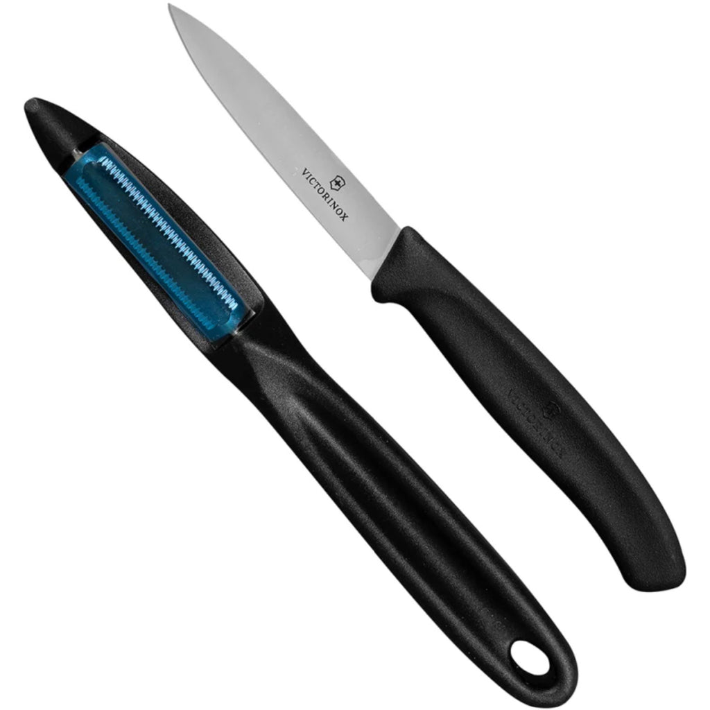 The Victorinox Paring Knife and Peeler Set is a professional quality kitchen tool combo designed for efficient fruit and vegetable prep in both home and commercial kitchens. The set features a 3-¼″ stainless steel paring knife and a matching peeler, each built for precision trimming, peeling, coring and garnishing.