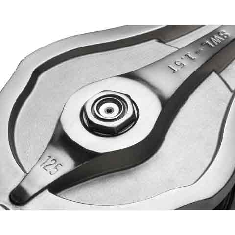 The high speed rotation performance of the sheave is important depending on where the block is used. Bearings in the sheave facilitate smooth rotation. The ribs on the front surface have an ideal balance of strength and material thickness. The bolt edge of the sheave pin is tightly fixed through crimping. Forged swivel for more safety.