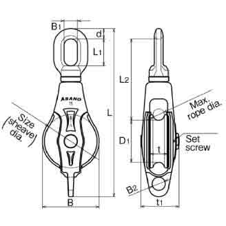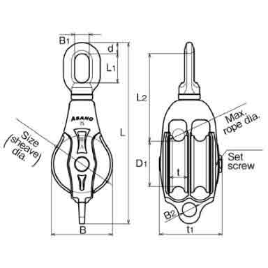 | Size (Sheave dia.)(mm) | Sheave Qty | Max dia of rope(mm) | d(mm) | L(mm) | L1(mm) | L2(mm) | D1(mm) | B(mm) | B1(mm) | B2(mm) | t(mm) | t1(mm) | Hex. Wrench dia.(mm) | Unit Weight(kg) | Work Load Limit(kg) |