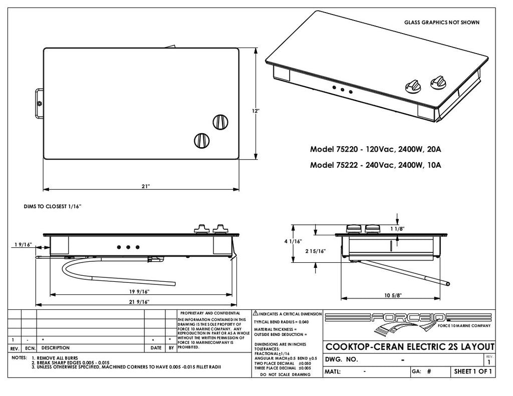 Electrical Requirement: 120 Volt | Frequency: 50 or 60 HZ | Number of Burners: 2 | Burner Output: 1200 Watts | Required Circuit Breaker: 30 Amp | Weight: 16LBS | Warranty: 2 years | Dimensions: 21" x 4" x 12"