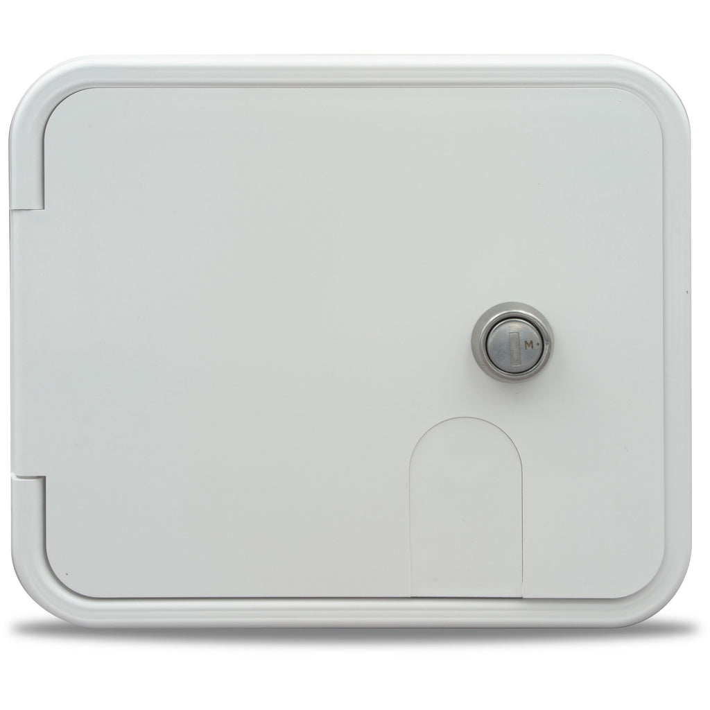 City/Gravity Water Center w/Plastic Check Valve, 865-94254, is a Polar White Water hatch has both a gravity water spout and cap for filling the fresh water tank and a city water fill for connecting to a water faucet. It has a replaceable plastic check valve. Factory tested for ZERO leakage. Comes with a Key Lock with a "Global Pro" interchangeable automotive type cylinder that can be changed to match your entry door lock or other compartments. Made in the USA! Direct OEM Replacement Lock is "key alike ready" to match your entry door or other compartment locks. Guaranteed not to Yellow, UV stable/colorfast Replaceable Door. Plastic Check Valve w/1/2" Male Pipe Thread Spout accepts either 1-1/4" or 1-3/8" water fill hose. Includes 3/8" Tank Vent Connection. Includes installation kit. IAPMO, NSF, and SCA Certified.
