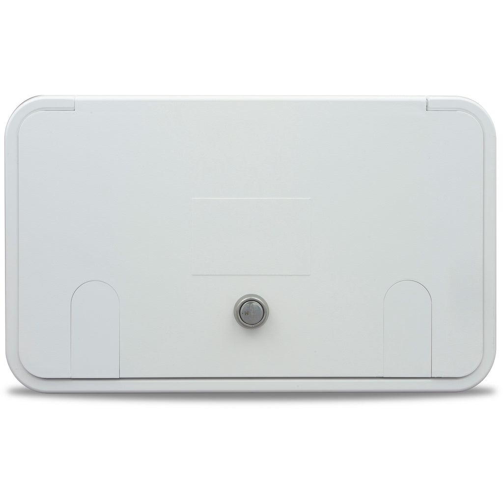 Lock is "Key alike ready" to match your entry door or other compartment locks. Dual vermin doors accept both 30 and 50 amp cord. Includes installation kit. Made in the USA. Size: 7-3/4" H x 12-5/8" W. Cutout: 6" H x 11-1/16" W.