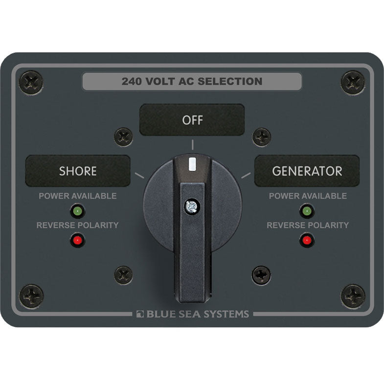 Blue Sea Systems, AC Rotary Switch Panels, 2 positions + OFF. Provides a compact and intuitive solution for safely managing AC sources when circuit protection is provided elsewhere.