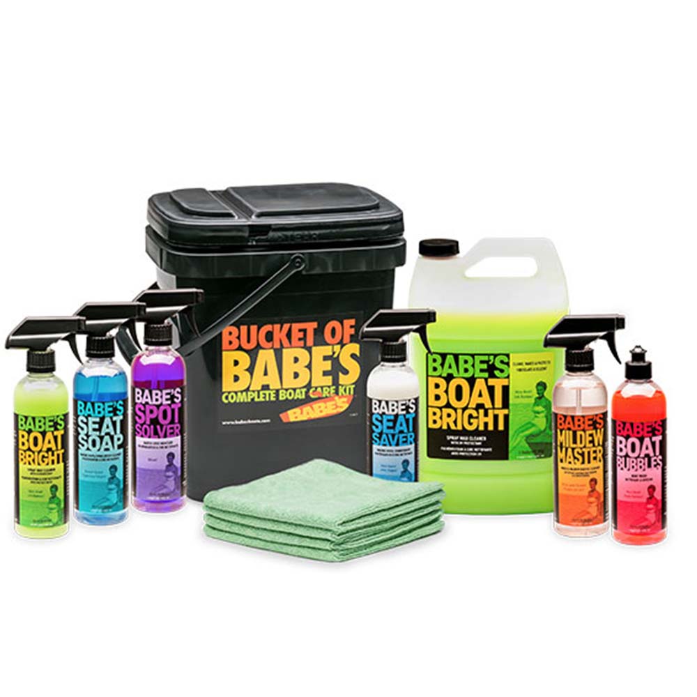 Complete kit comes in a heavy duty plastic bucket with hinged top for quick access. Great for storing all the essentials for keeping your boat looking new. Bucket of BABE's includes: 1 Gallon BABE's Boat Bright, 16 oz BABE's Boat Bright, 16 oz BABE's Seat Soap, 16 oz BABE's Seat Saver, 16 oz BABE's Spot Solver, 16 oz BABE's Boat Bubbles, 16 oz BABE's Boot Butter, Pkg (4) Extreme Performance Towels