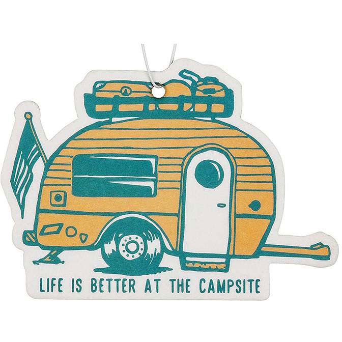 Life is Better at the Campsite Air Freshener provides a fresh, long-lasting, clean scent. It is perfect for small areas in your RV, car, or home. The elastic tie cord allows it to be easily hung anywhere.