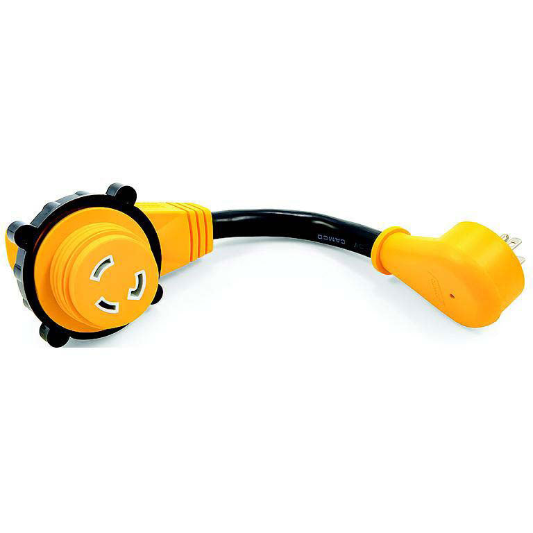 For hooking your marine-style 30-Amp or 50-Amp RV power inlet to a standard power source. 90 Degree connector reduces strain on the cord and allows easier connection in tight places. Threaded locking ring helps to create a weatherproof connection.