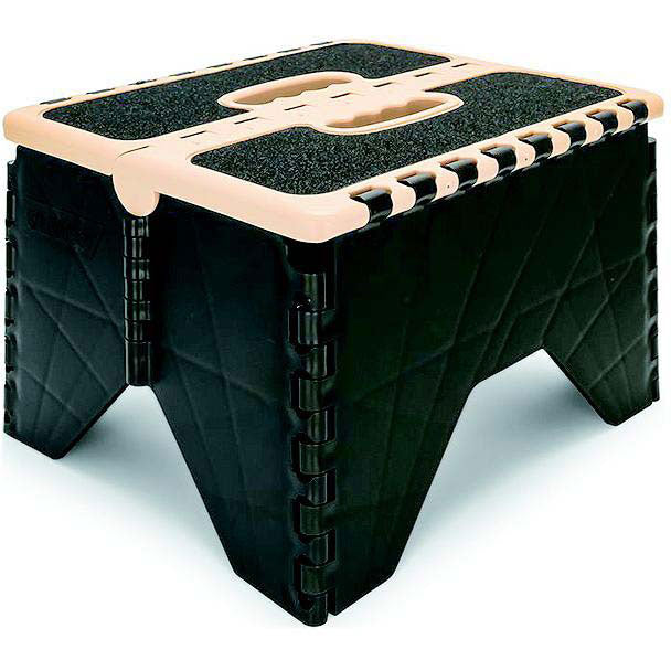 A great option for small spaces, because it folds flat for storage when not in use. The Step Stool provides a 9" step, and a textured, non-slip surface. The stool can support up to 300 lbs and is made of durable, UV stabilized, impact resistant resin. The area of the top of the step measures 11-1/2" x 13". Folds to 15" x 14" x 2".