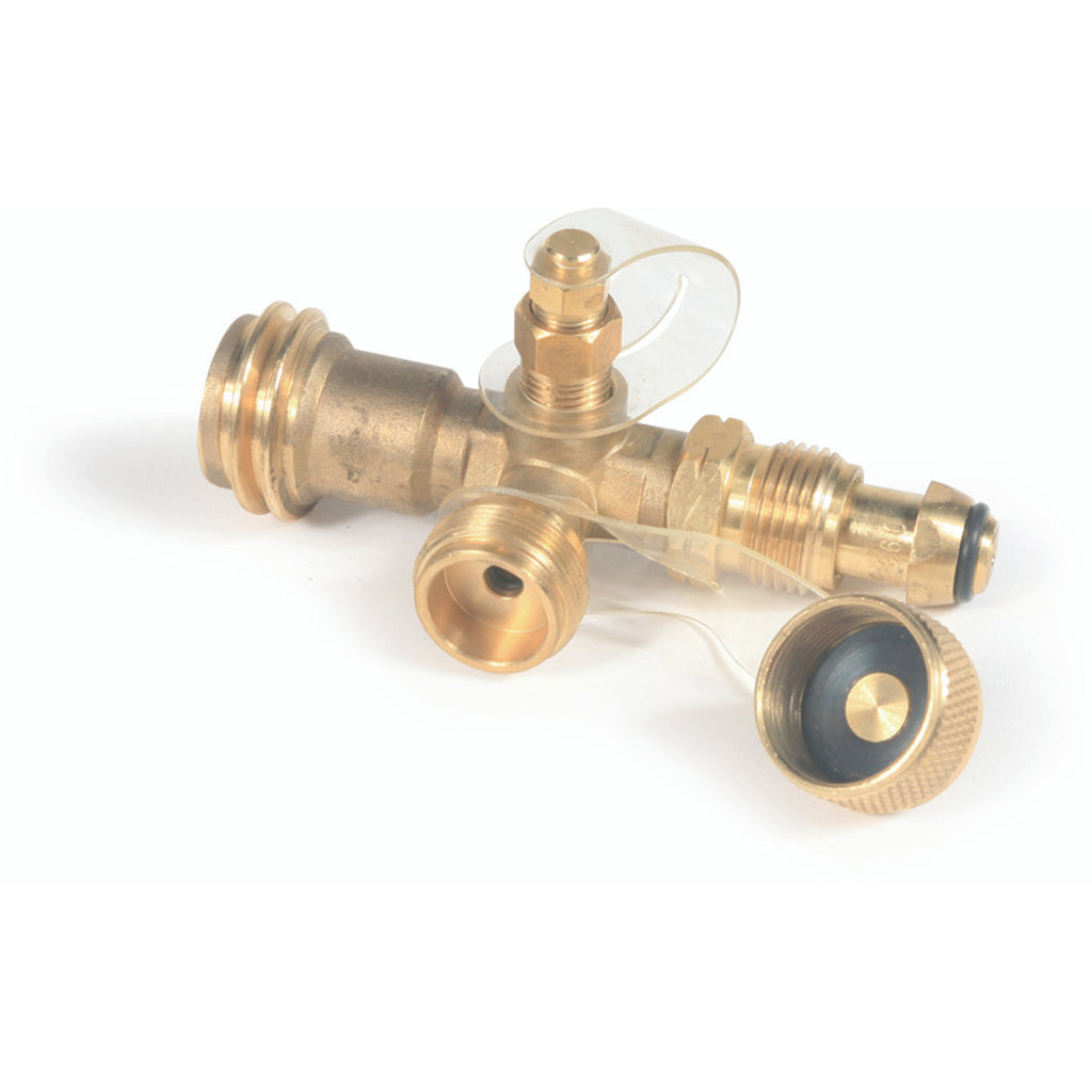 The Camco RV 4-Port Propane Tee mounts in-line between the supply and regulator on a motorhome to allow the connection of an additional propane appliance and the hook-up of an auxiliary propane cylinder. Its ports include a Female POL & Male ACME Thread, Excess Flow Soft Nose POL, 1”-20 male throwaway cylinder thread and ¼” Inverted Flare. For use ONLY on motorhomes with a permanently installed tank.