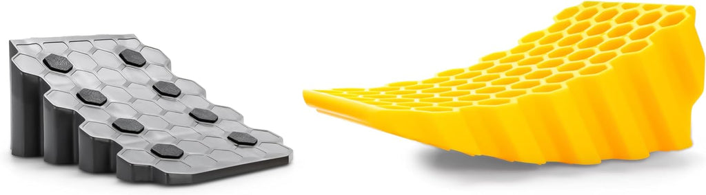 The Camco Curved Leveler is a simple way to level your vehicle by giving a tire up to 4-inches of extra lift. The honeycomb design makes the leveler lightweight but durable. The drive-on curved design allows you to only drive on to as much height as needed, then chock the leveler at the exact right height. The included chock has non-slip rubber grippers on the bottom. Patented.