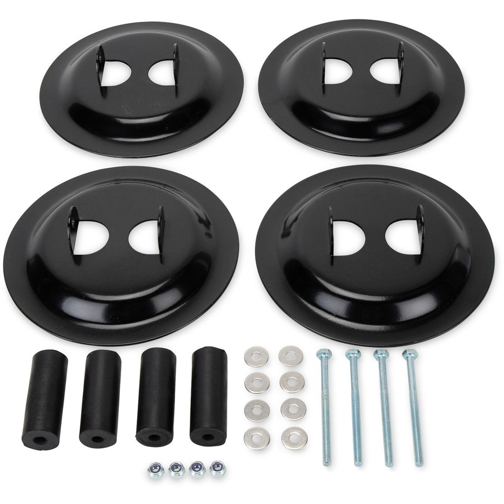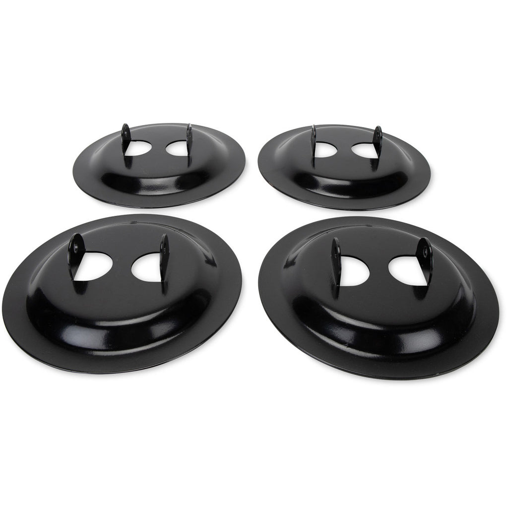 Camco's Heavy-Duty RV Stabilizing Jack Base Pads help stop your jacks from sinking into the soft ground. The large, 7-5/16-inch diameter base pads provide greater jack stability. These pads are compatible with most RV cross-frame or “T” type stabilizing jacks. Includes: (4) base pads, no-rattle rubber grommets and installation hardware. This product is constructed of durable steel that is black powder-coated to help stop rust and corrosion; zinc-plated screw assembly.