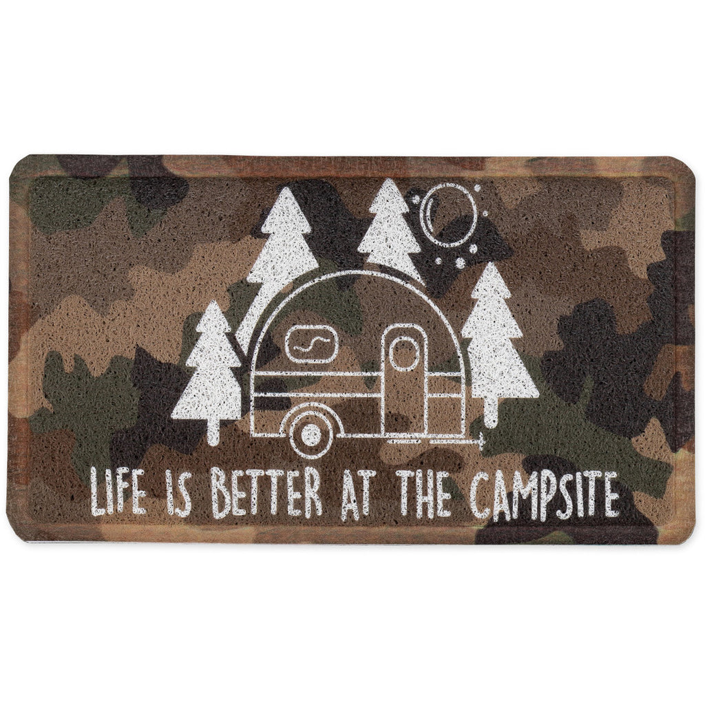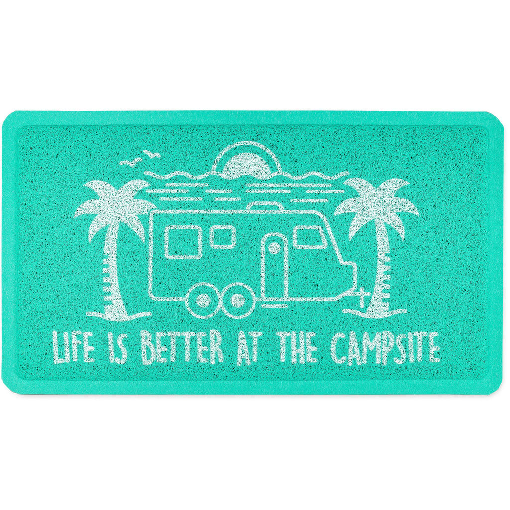 Camco's stylish Life Is Better at the Campsite scrub rug is great for your home, the outdoors, under a pet bowl or even camping. Use it to help trap dirt and debris to prevent bigger messes. The rug is made of looped PVC material that dries quickly, provides a cushioned step and is easy to clean. It has a rubber skid-proof backing that helps the rug remain in place even in high traffic areas. This product is weather and mildew-resistant and can be placed indoors or outdoors. Measures 26-½-inches (L) x 15-inches (W).
