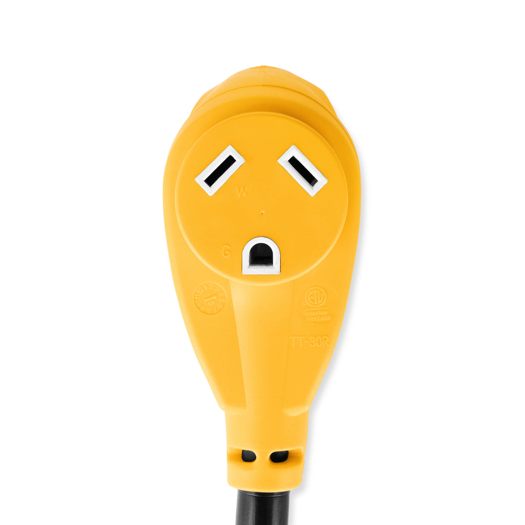Camco's 12" Power Grip Dogbone Electrical Adapter with easy grip handle is designed for greater convenience and ease of use. It features 15 AMP male to 30 AMP female ends. 125V/1875W.
