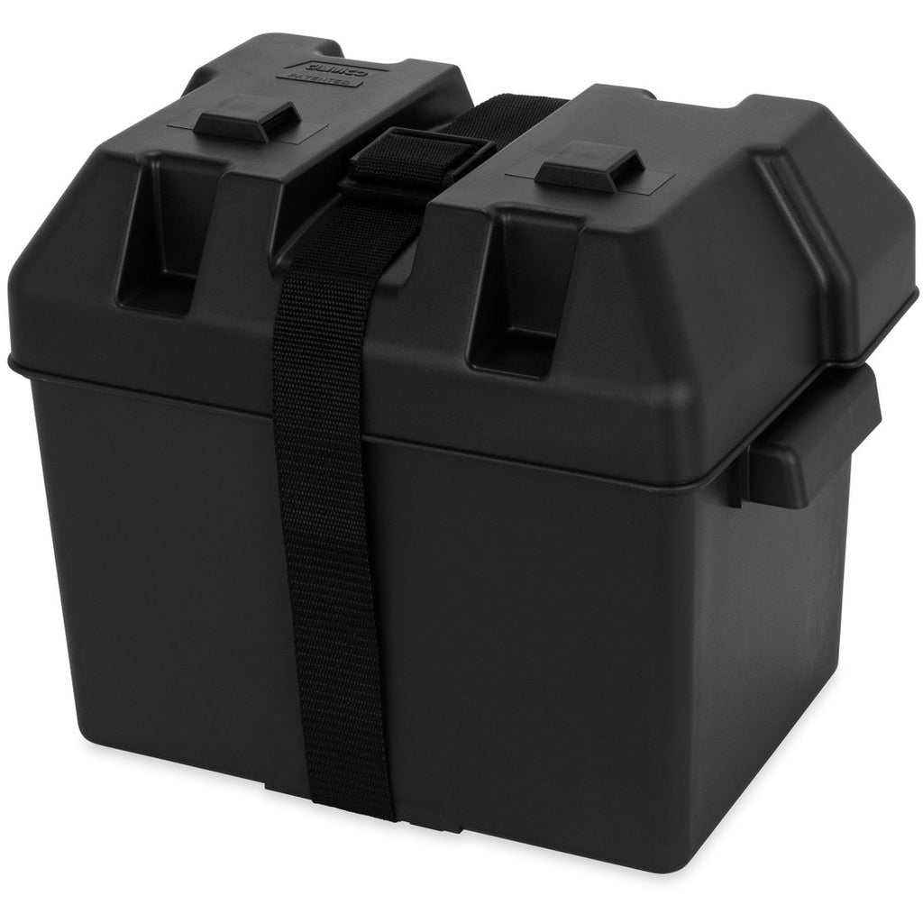 Camco RV Standard Battery Box is a black lightweight, heavy-duty corrosion-resistant polypropylene box which is designed to secure and protect the battery. It includes lift-off lid, durable woven hold-down strap, foot clamps and stainless steel screws. This box meets USCG CFR 183.420 and ABYC E-010.7 specifications. It fits group size 24 batteries with inside dimensions of lid 7 ¼” Wide X 10 3/4” Long X 8 ” Tall with 2” additional head room for battery terminals.