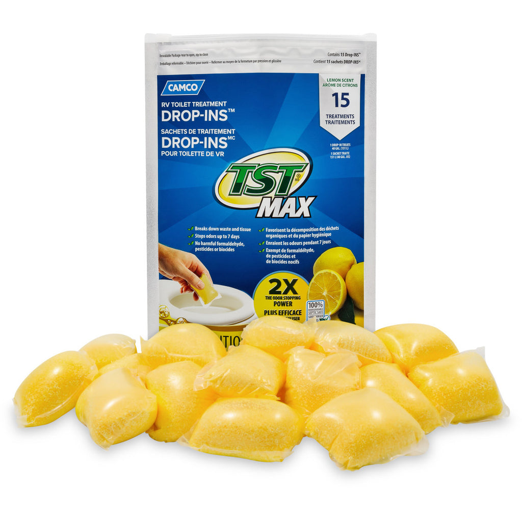 The TST MAX Drop-Ins help control unwanted odors and break down waste and tissue in your black water holding tank. The easy-to-use drop-ins contain a special chemical that helps break down waste, and a blend of hibiscus-scented surfactant oils that trap unwanted odors in your tank, making your camping experience more enjoyable. The drop-ins are RV and marine approved, non-formaldehyde and safe for all septic tanks—they’re even great for portable camping toilets! Each bag comes with (15) drop-ins.