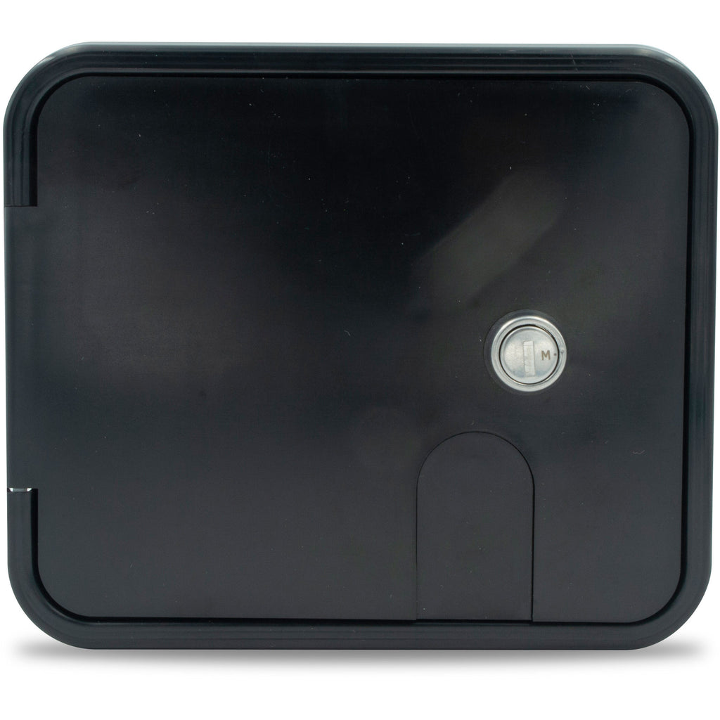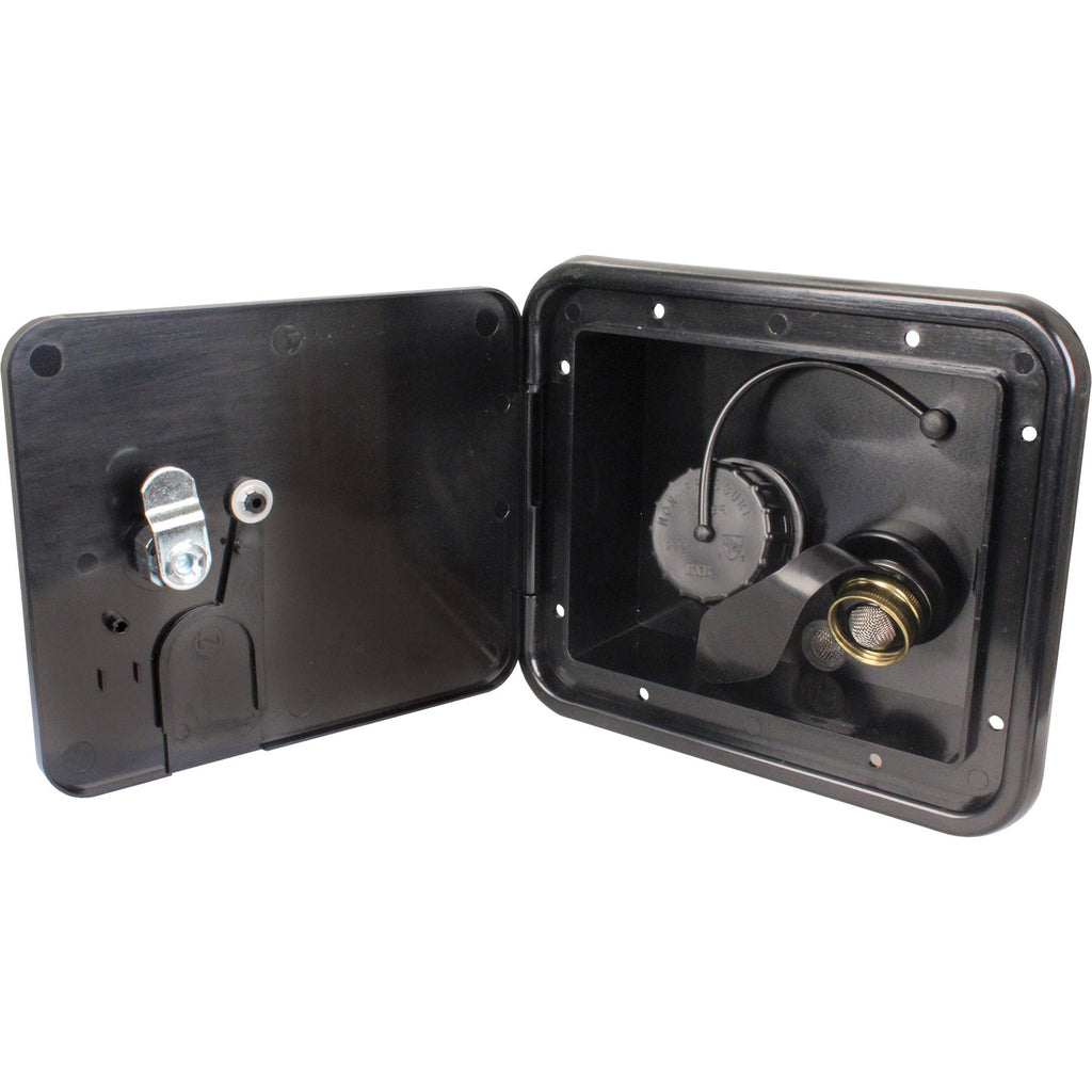 City/Gravity Water Center w/Brass Check Valve, Key Lock, Black, Guaranteed Not to Fade! Water hatch has both a gravity water spout and cap for filling the fresh water tank and a city water fill for connecting to a water faucet. Factory tested for ZERO leakage. Comes with a Key Lock with a "Global Pro" interchangeable automotive type cylinder that can be changed to match your entry door lock or other compartments. Made in the USA