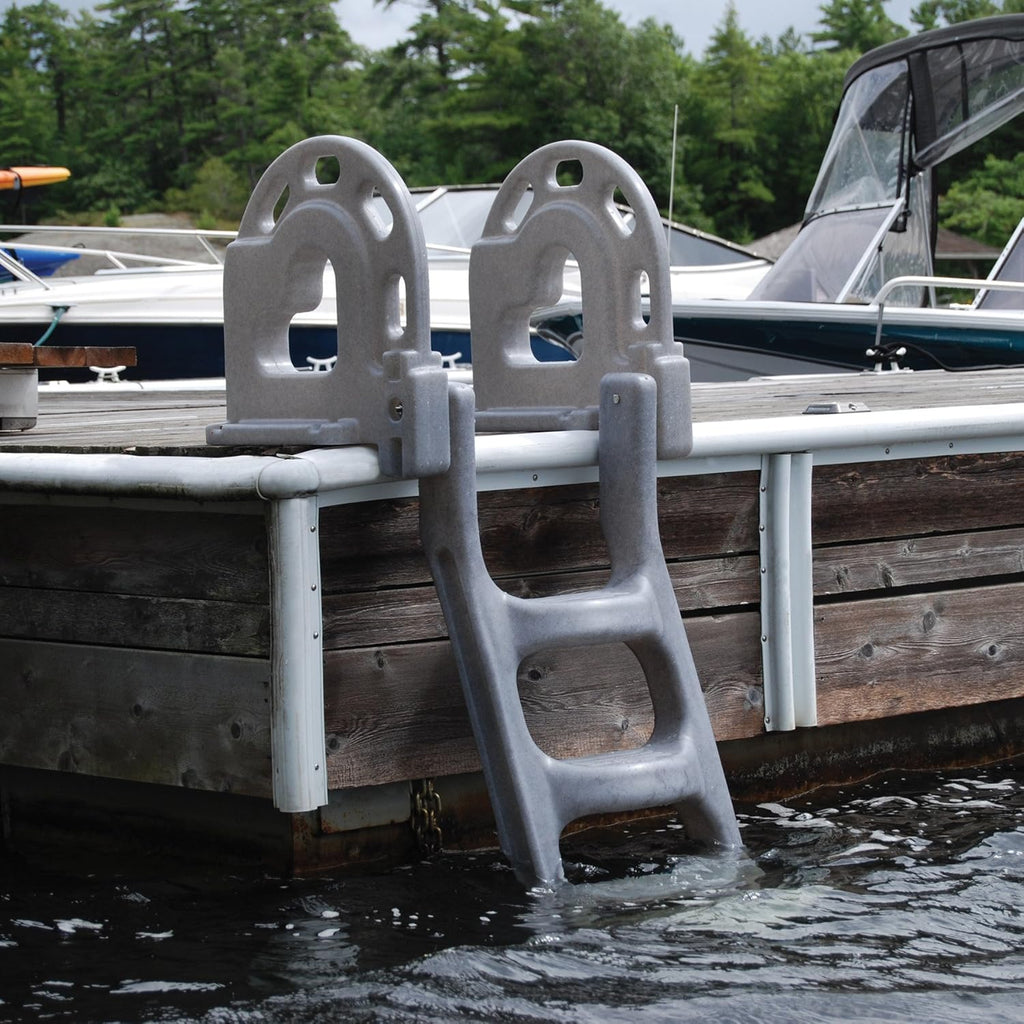 Tough and durable, this roto-molded ladder swings up and out of the way, locking in place when not in use. Will not corrode with exposure and will not fade or crack. Molded-in U.V. inhibitors and fungicides. Polyethylene, Stainless Steel hardware. Gable Height: 20-1/2"; Gable Depth: 19-1/2"; Tread Depth: 4"; Tread Width: 14"; Distance to first step: 12-1/2"; Distance between treads: 10-1/2"