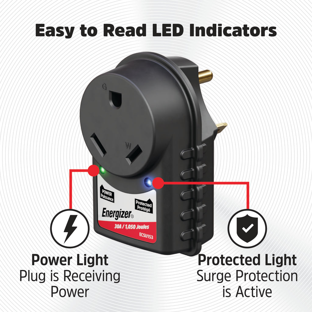 • Energizer 30A Plug & Play RV and EV Surge Protector defends your onboard appliances and electronics against power surges and spikes.