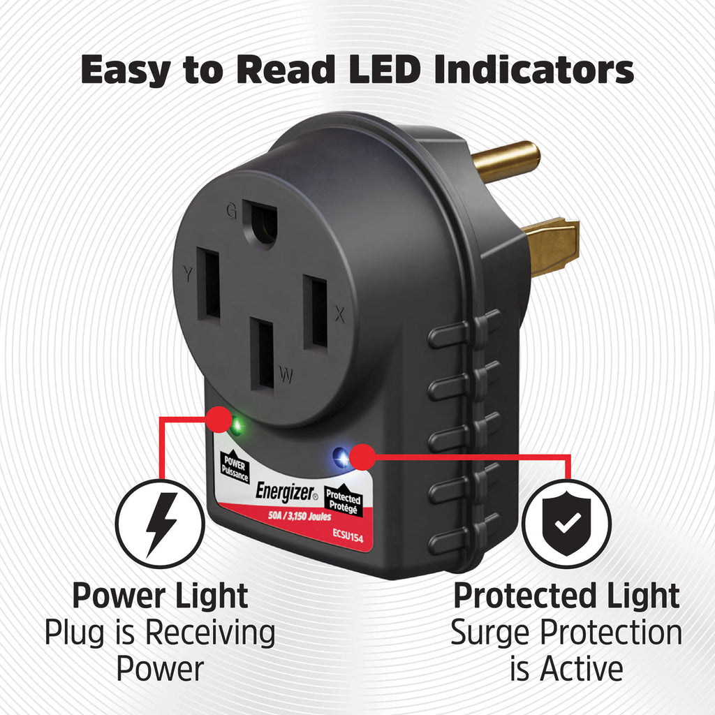 • Energizer 50A Plug & Play RV and EV Surge Protector defends your onboard appliances and electronics against power surges and spikes.