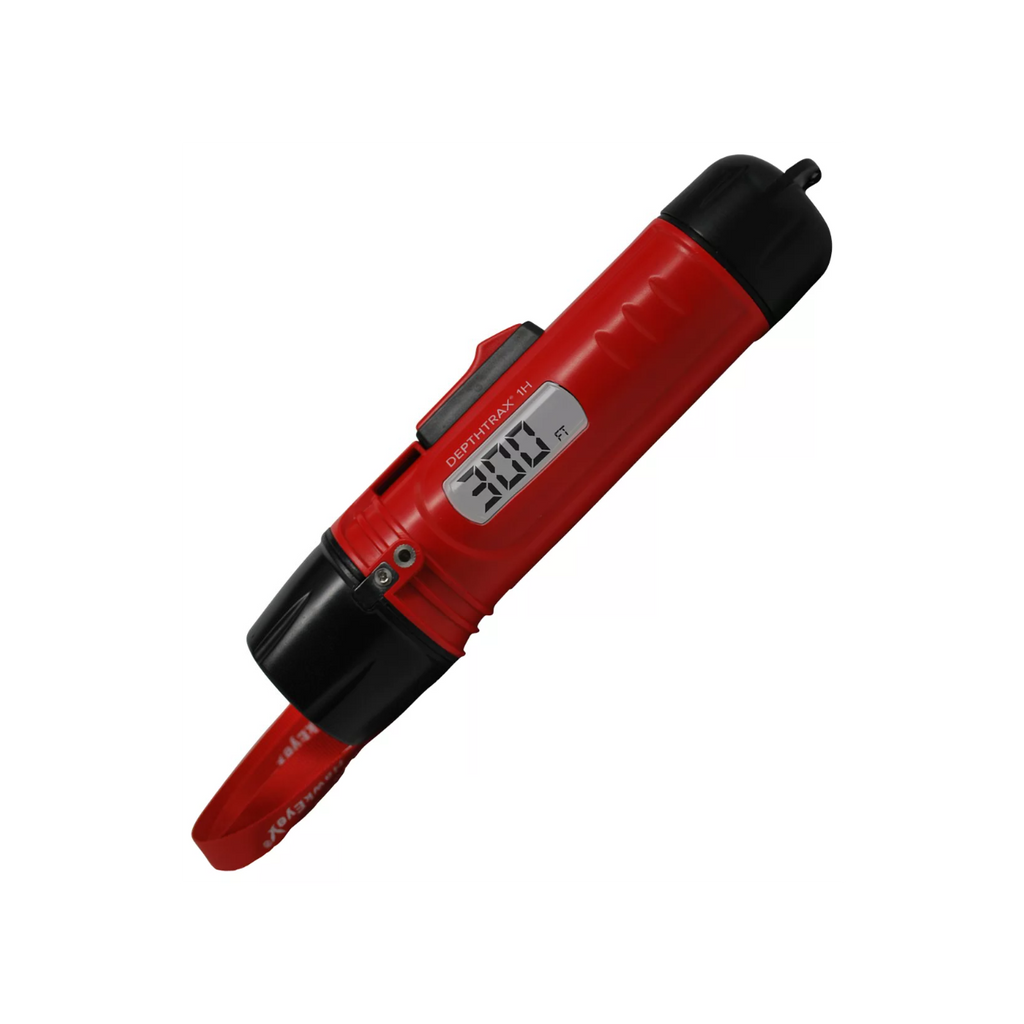 Ultralight handheld DepthTrax™ 1H with Intelligent Sonar lets you aim it's beam wherever you want to see, like an underwater flashlight. One slide of the magnetic switch gives real time depth readings, while another slide will indicate the current water or air temperature. Algorithmic programming virtually eliminates false readings. Delivers precise depth readings up to 240'.The impact resistant and floatable housing includes a wrist strap. Diver designed waterproof rating to 150' depths, allows the DepthTrax™ 1H to be used as a range finder while snorkeling and diving.Batteries: 9 volt alkaline; Display Type: Liquid Crystal; Waterproofing: IPX 8 (150'); Op. Temp. Range: -10-160°F; Depth Range: 2' to 240'; Integrated Tranducer reads to 300'; Frequency: 200kHz; Beam Angle: 20°; 2 Year Warranty