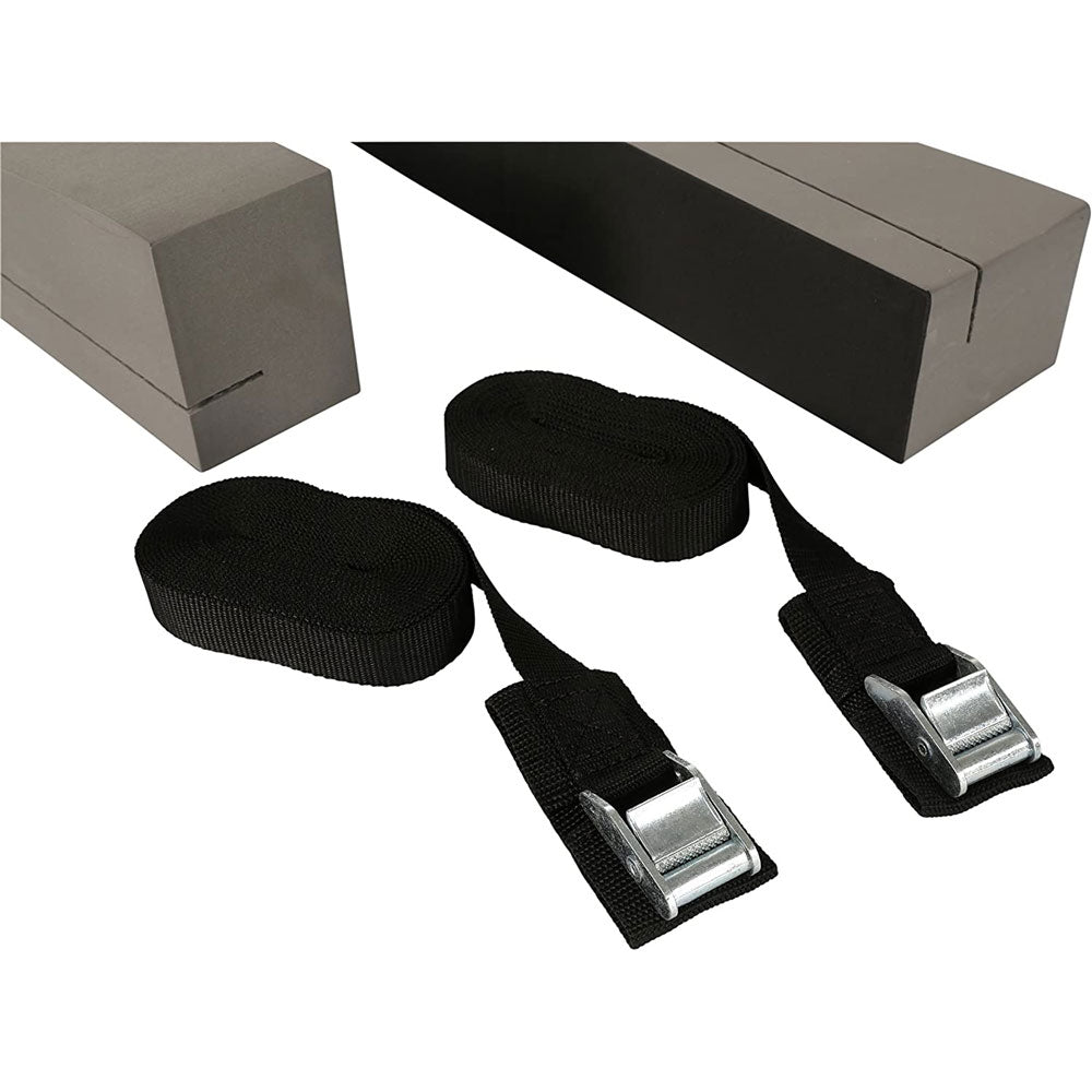 A simple, convenient kit for carrying a kayak on car top. Includes two supporting foam blocks that help prevent scratches on car top. Two straps with adjusting buckles and clips. Includes 20' of polypropylene rope to secure bow and stern to bumpers. Straps are sturdy poly web with vinyl-coated clips.
