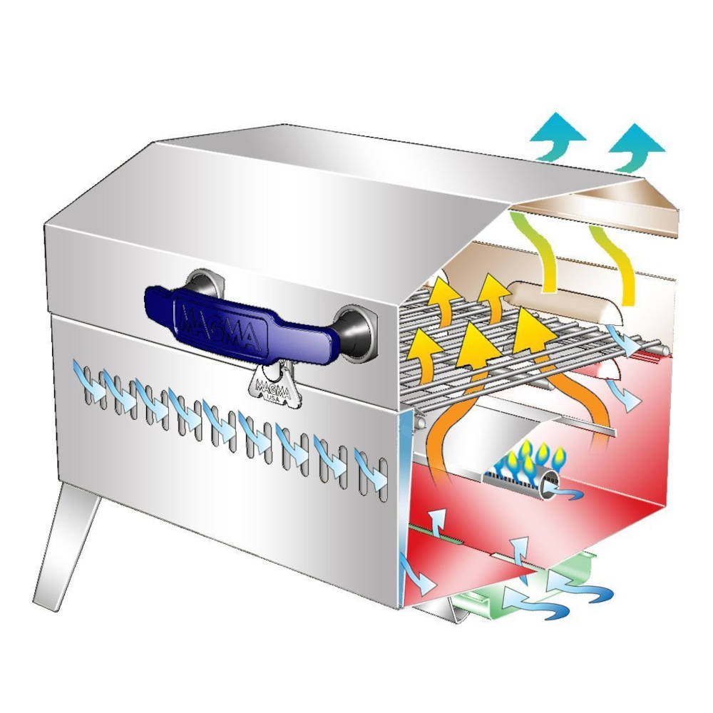 The Magma Cabo Gas Grill with Fold-Away Legs, A10-703, lets you grill on your boat and where ever adventure takes you. The Cabo Grill packs all the Magma quality you expect with its 100% 18-8 mirror polished marine grade stainless steel construction and 9” x 18” (162 sq. in.) grilling surface. The Cabo features include an oversized yet balanced lockable lid with draw tight latch, durable heat resistant all-weather handle with air cooled supports, fold-away table top legs, locking grease tray with access from either side of the grill, and a convenient snap-out radiant plate assembly for even heat distribution. The swiveling control valve / regulator, designed to use 1lb. disposable propane fuel canisters, allows for quick, safe fuel canister exchanges or easily adapt to existing low pressure propane (LPG) or natural gas (CNG) fuel systems.
