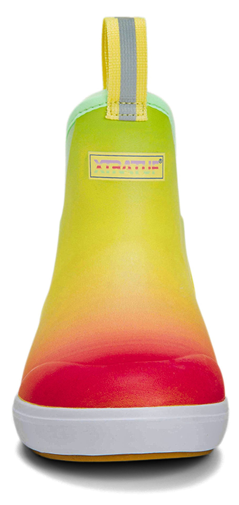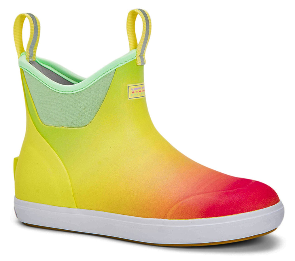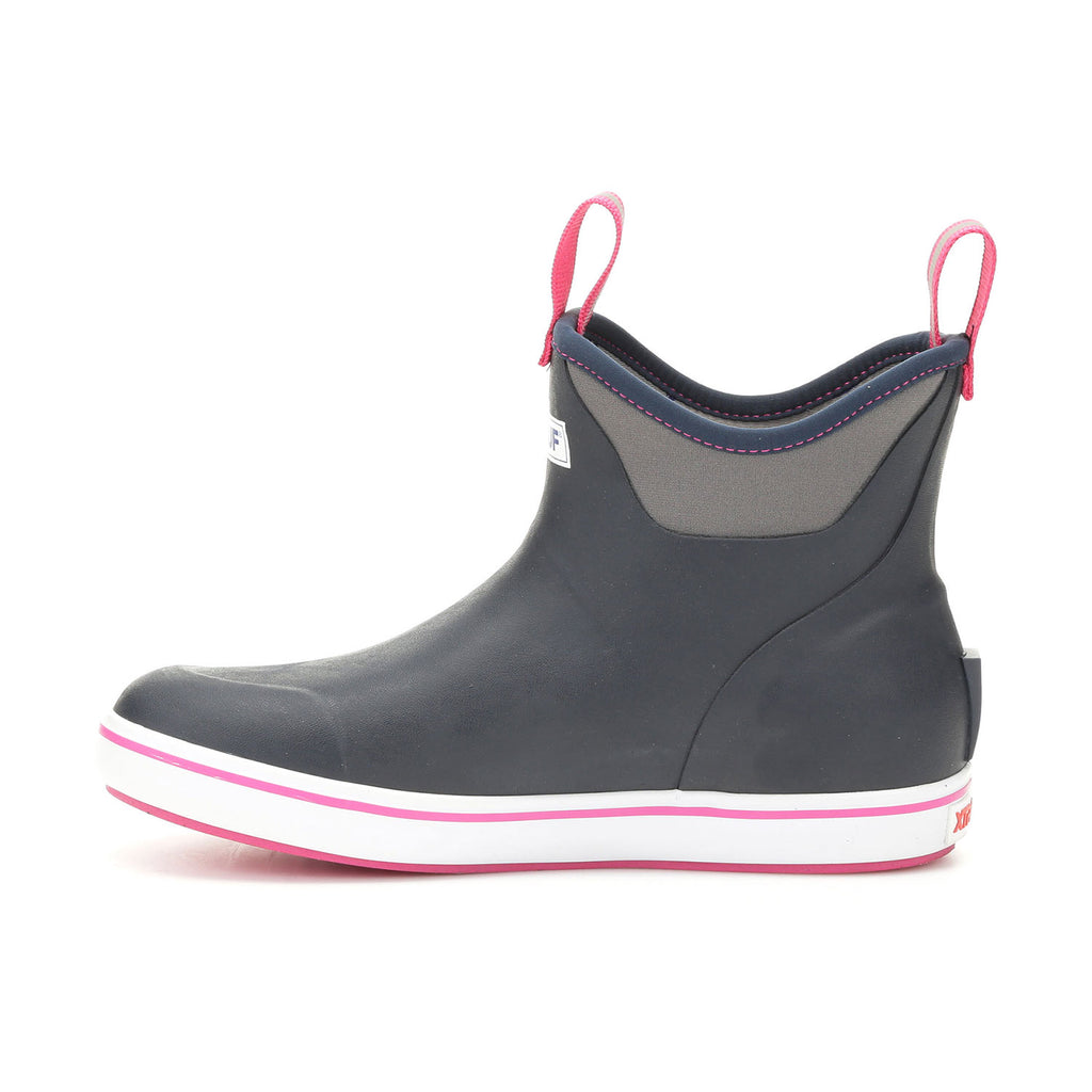 These boots have been returned and inspected. They are in almost new condition but have one of the following conditions, may not have the original boot box, may show light signs of being tried on, or may have a small scuff or discoloring from the manufacturer. The Ankle Deck Boots have been crafted specifically for sport and recreational fisherman. Anglers are athletes and they need proper footwear to help them perform at their best. We've created a lightweight silhouette with the same XTRATUF non-marking, slip resistant Chevron outsole as our iconic Legacy Boot, worn by commercial fisherman in Alaska. This women's version provides protection from wet surfaces with slip-on-and-go convenience that can be worn on or off the boat offering 100% Waterproof protection. The interior boasts a highly durable fabric that allows the foot to breath for long days on the water.