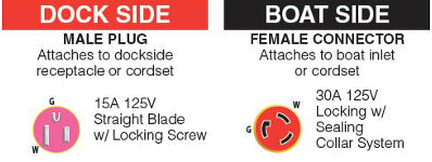 Marinco Pigtail Power Adapter with LED Indicator pairs a 30A 125V locking male connector to a 15A 125V straight blade female allowing you to connect your boat to off-board power that has a dissimilar power configuration. Marinco adapters are fully molded for durability on your boat and dock side.