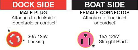 Marinco Pigtail Power Adapter with LED Indicator pairs a 30A 125V locking male connector to a 15A 125V straight blade female allowing you to connect your boat to off-board power that has a dissimilar power configuration. Marinco adapters are fully molded for durability on your boat and dock side.
