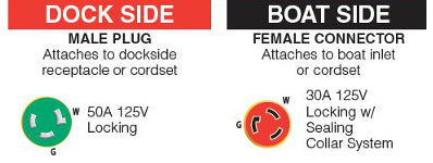 Pigtail Shore Power Adapter with 50A 125V locking male end paired to a 30A 125V locking female socket with a sealing collar to safely power your boat with a dock side or other external source. These adapters are fully molded and equipped with the Marinco's unique sealing collar for use in wet locations.