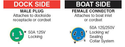 This Marinco Pigtail Shore Power Adapter converts connections between a 50A 125V locking male plug and a 50A 125/250V sealing collar, locking female receptacle. Marinco shore power adapters match your boat's onboard power to an off boat power source with a dissimilar configuration and are designed for use in wet locations.