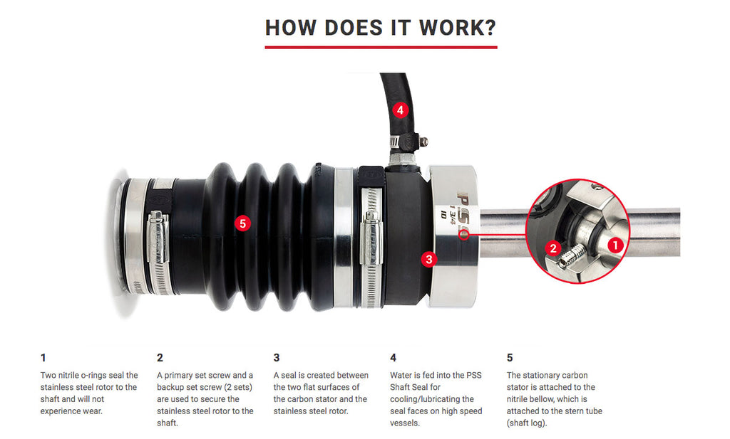 A mechanical seal is created by the contact of a turning surface against a stationary surface. In the case of the PSS Shaft Seal, the stationary surface is a carbon flange held in contact against a stainless steel rotor which turns with the shaft. The carbon flange is attached to the boat by a nitrile bellow which, with the help of water pressure, produces a constant contact between the carbon and the stainless steel ring. These type of seals are unaffected by engine motion or vibrations. The result is a 100% watertight and totally maintenance-free seal.
