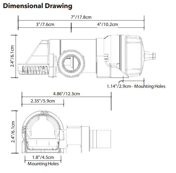 LoPro 900 Series pumps work in small locations with a designed pump height of 2.3" (58.4mm). The LoPro's entire discharge body swivels up to 180 deg. for ease of installation and the hose can swivel 360 deg. for better routing. The threaded discharge nozzle allows the use of 3/4" (19mm), 1" (25mm), 1-1/8" (28mm) Straight Hose barb or 3/4"(19mm) 90 deg. Elbow ports (included). An included tricuspid check valve minimizes water back flow when used with straight fittings.