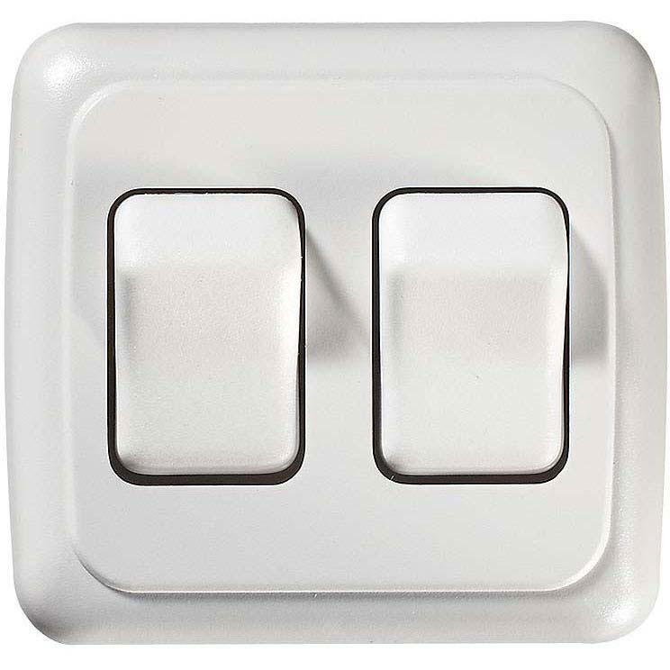 RV Designer S533 White Double On/Off Contoured RV Switch in Plate. Contemporary Contour design.Includes: 2 Switches, Base and Bezel.Typical Applications: Lighting Control, Entry Steps, Appliances.