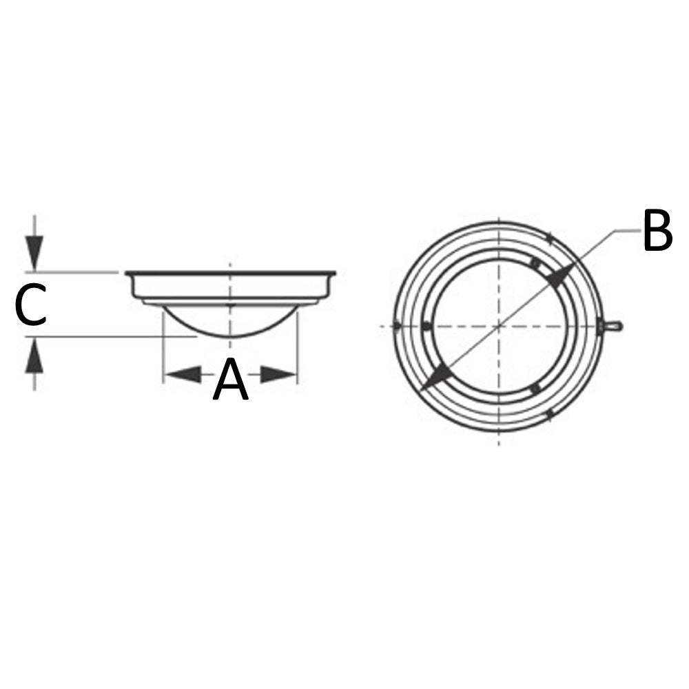 Material / Finish: Stainless Steel / Stainless Steel | Socket: BA15d Socket (double contact) | Style: Interior, Dome, Overhead, Bulkhead, Reading, Surface Mount | Switch: Yes | A: 4" | B: 5-1/2" | C: 2"