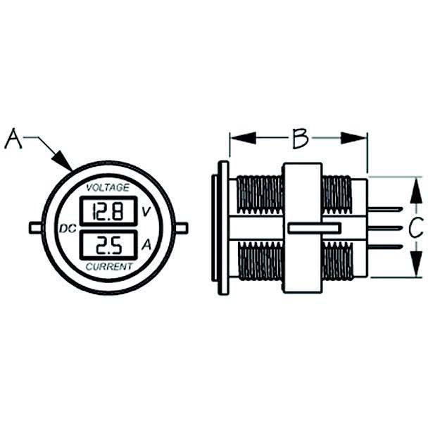 Injection molded nylon. Compact size allows for installation in a variety of locations the same round size as a standard 12V receptacle. For interior or fully protected locations only. DC shunt not required. Volts 4-30. Amps 10.
