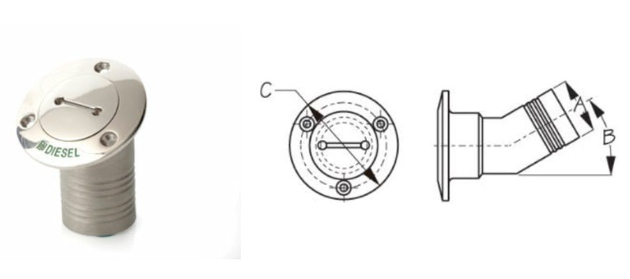 These 30° Angled Hose Deck Fills feature a slotted cap which requires a key to open and close for extra security. 1-1/2” hose deck fill cap diameter 1-7/8", thread pitch 11-1/2 NPSM straight. 2” hose deck fill cap diameter 2-1/8", thread pitch 11-1/2 NPSM straight. All fills and replacement caps (except waste) include attachment cable (0P35105). Constructed of investment cast 316 stainless steel. Installs with three #10 FH fasteners (not included). USCG regulations require bonding wire to prevent sparking. Gasket not included.