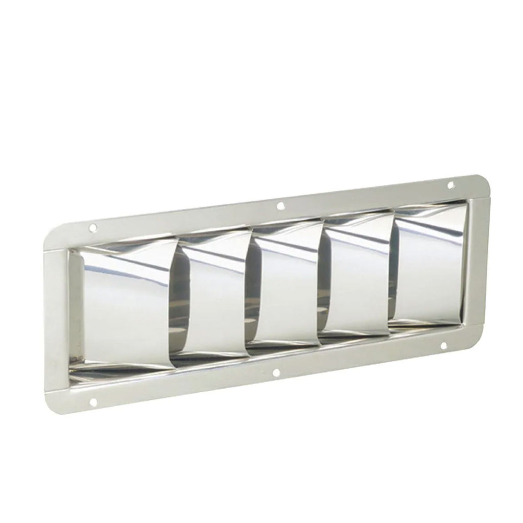 All-welded 304 stainless steel construction with polished finish. Adapts to 3" or 4" ventilation systems. Predrilled with six mounting holes to accommodate #8 screws. Dimensions: 11-5/16" L x 4-3/8" H x 3/4" D