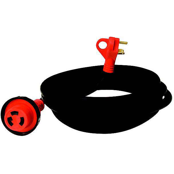 Heavy duty 50Amp RV power cord features a detachable female receptacle with locking ring and finger grip handle on the male end. Extends power up to 25' from the original source. Constructed with heavy duty 6-8 gauge cable Water tight connections for safe, outdoor use 125V, 3 conductors cETL listed