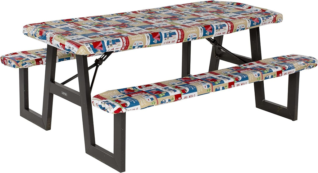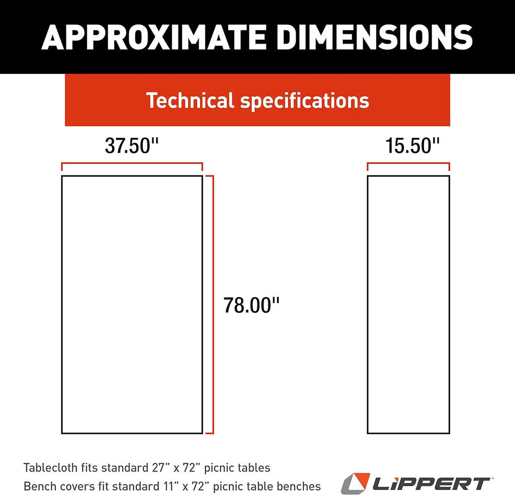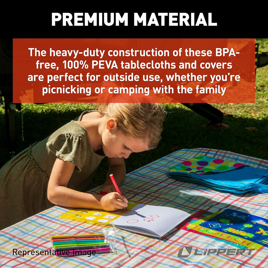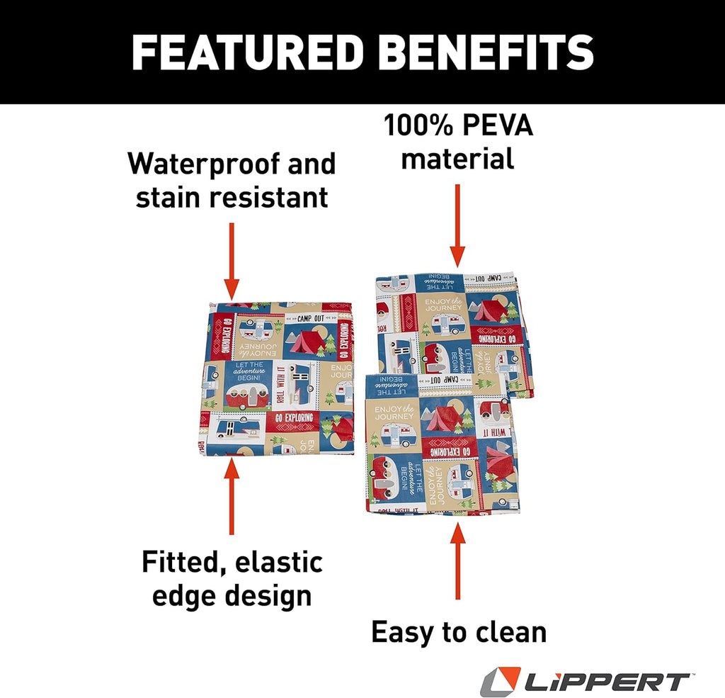 With a Lippert BPA-Free Vinyl Tablecloth & Bench Covers, camp meals are fun as well as clean & tidy. Several patterns, like this "Camping Patchwork" pattern.