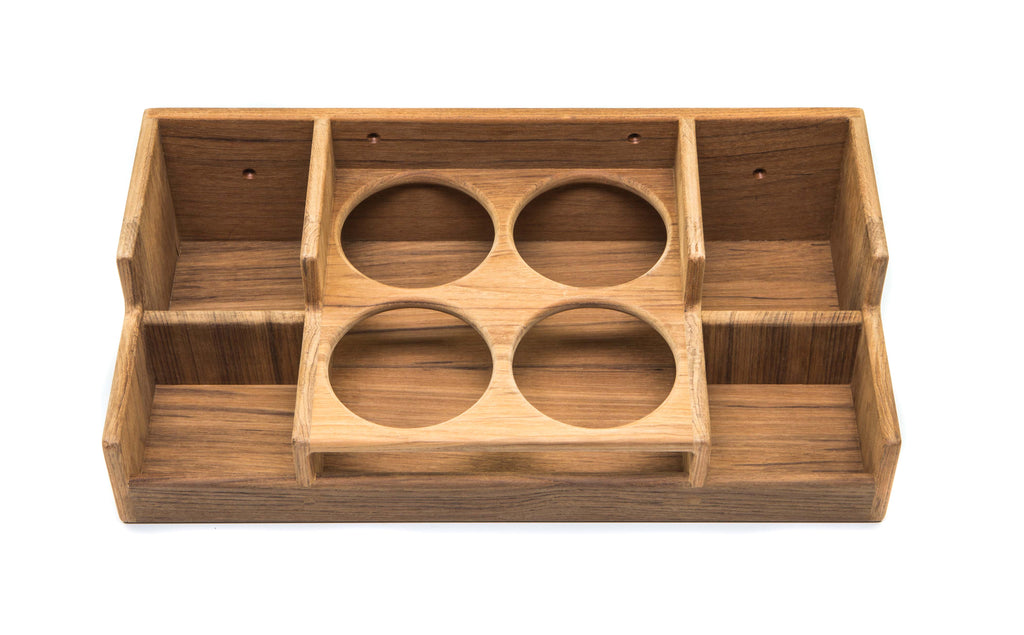 Holds 4 glasses, 2 bottles, storage for bar accessories