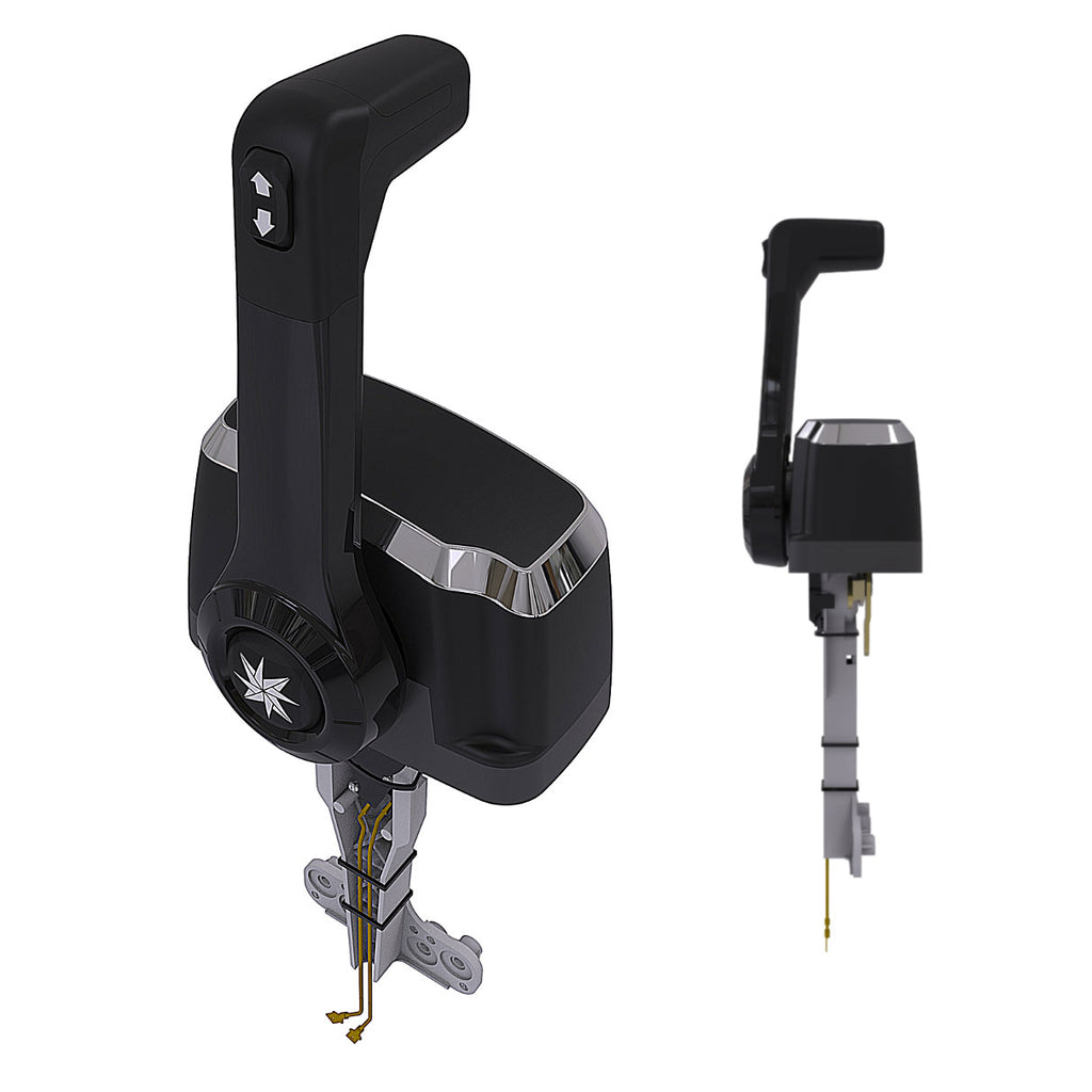 Xtreme Top Mount Control is a single lever, dual-function control in black with ergonomic fit and performance features for smooth yet positive feel. The handle is on the left side of the bezel on these Xtreme Top Mount, dual-function controls. Neutral throttle warm-up & start-in-gear protection are standard on all Xtreme controls but these do not have a Neutral Interlock on the handle.